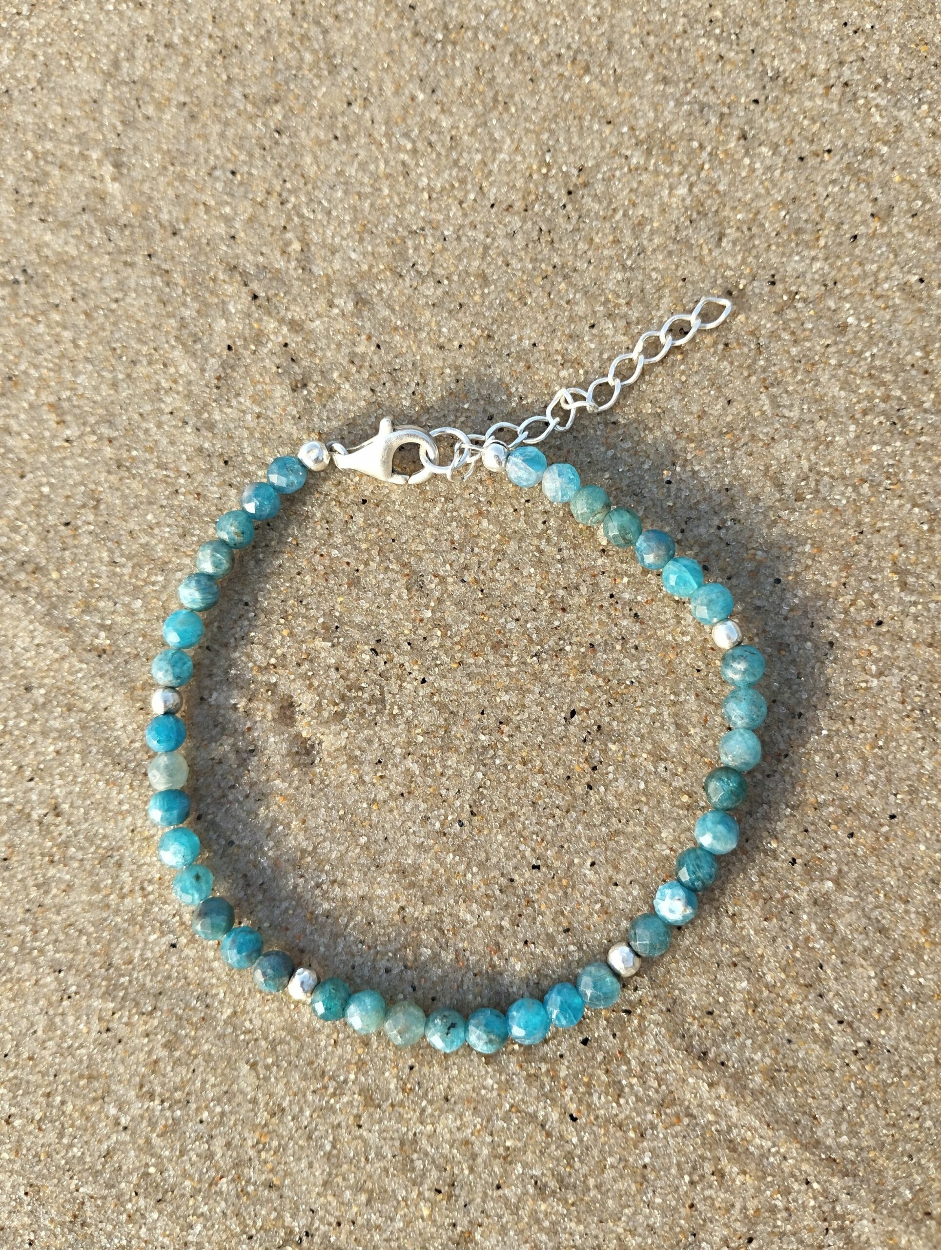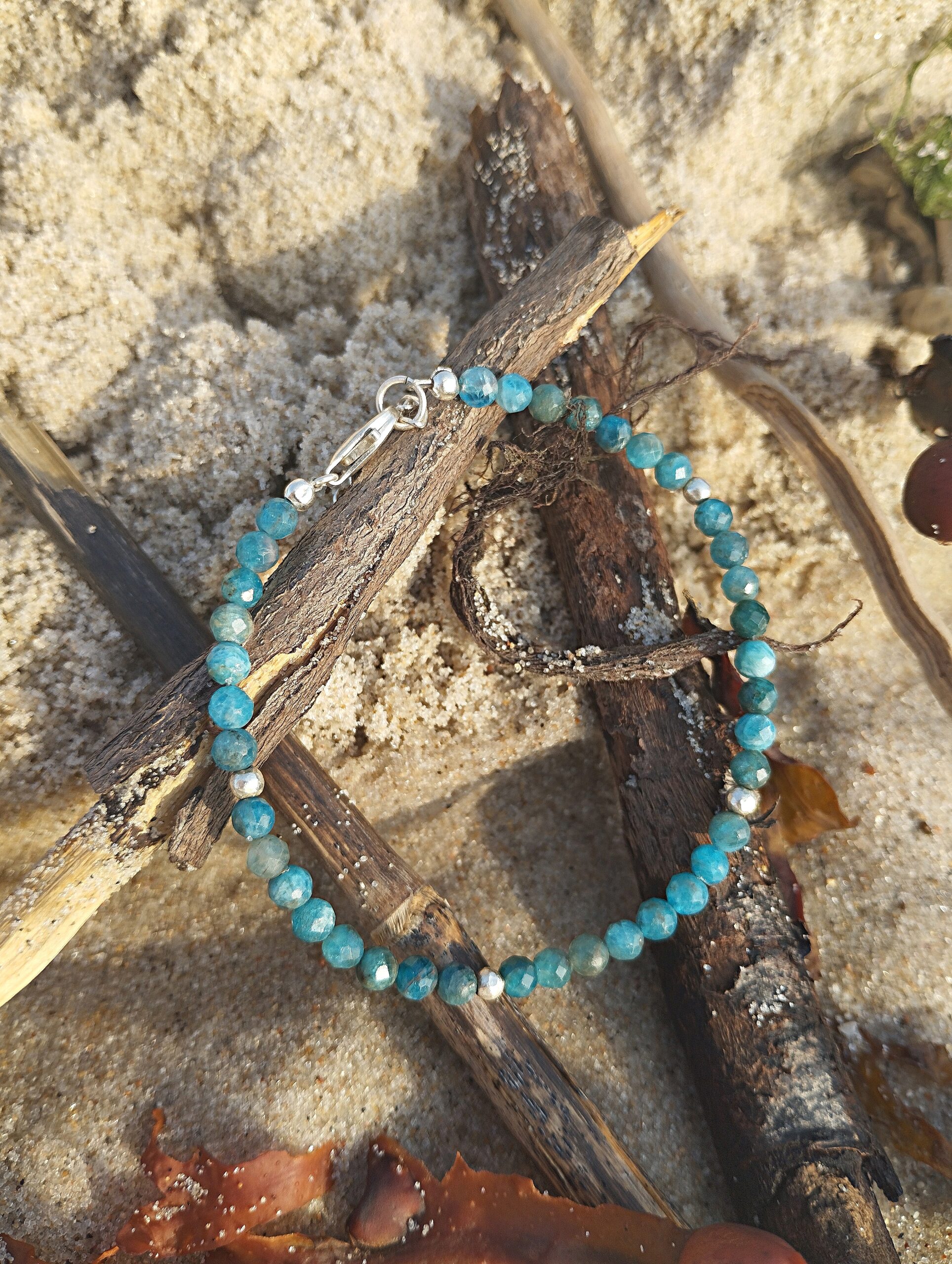 Bransoletka wykonana jest z naturalnego apatytu, kamienia inspiracji i komunikacji, oraz wykończona srebrnymi elementami, które nadają jej eleganckiego blasku.