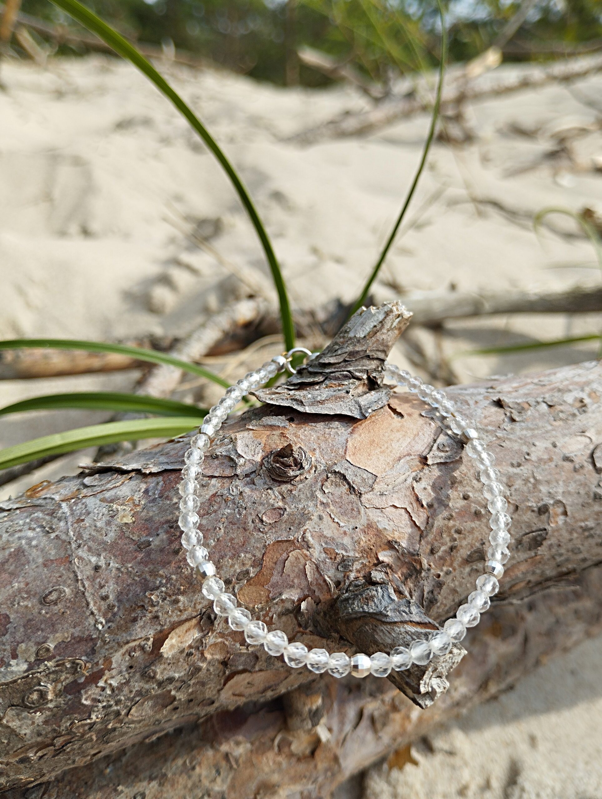 Bransoletka wykonana jest z naturalnego kryształu górskiego, kamienia czystości i światła, oraz wykończona srebrnymi elementami, które podkreślają jej szlachetny charakter.