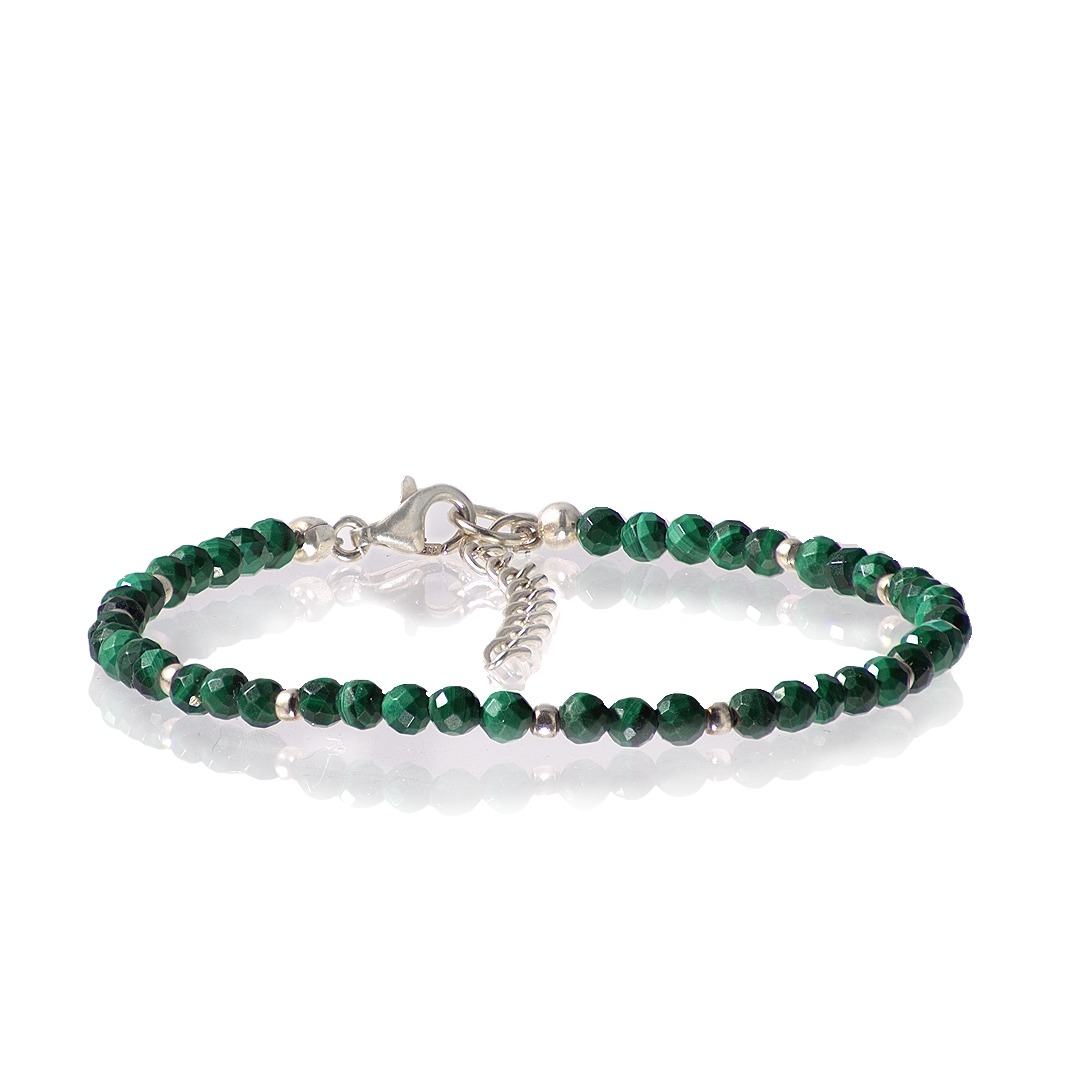 Bransoletka wykonana jest z naturalnego malachitu, kamienia głębokiej przemiany i odwagi serca, oraz wykończona srebrnymi elementami, które dodają jej subtelnej szlachetności.