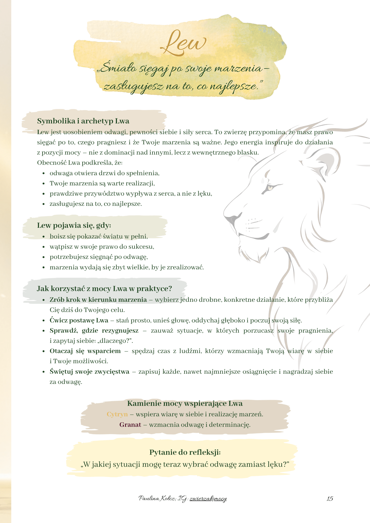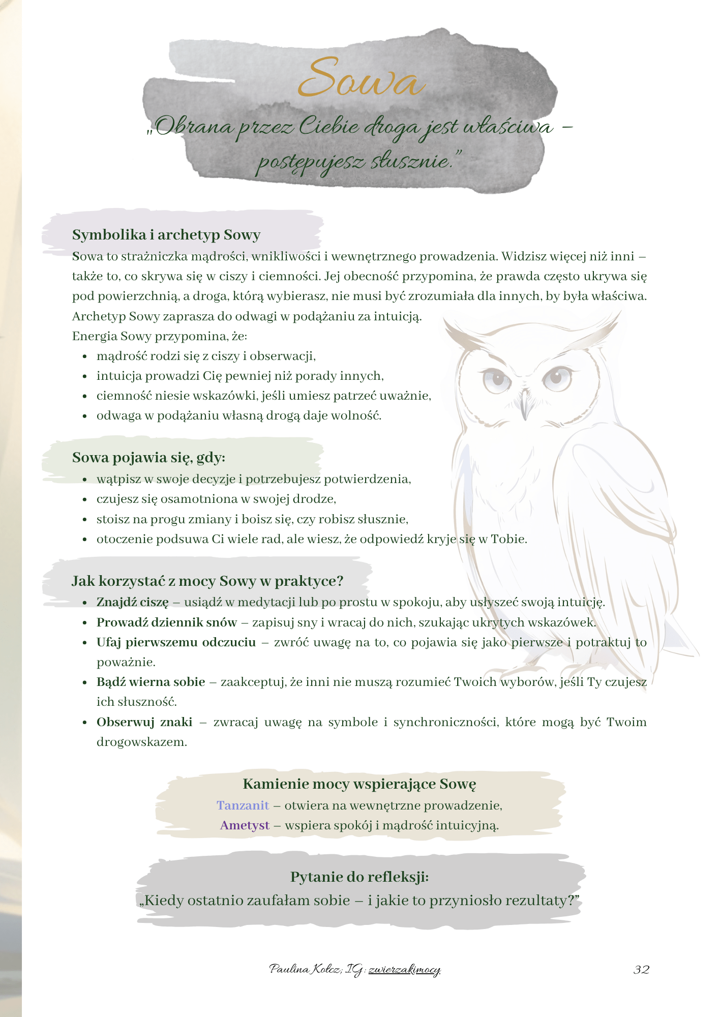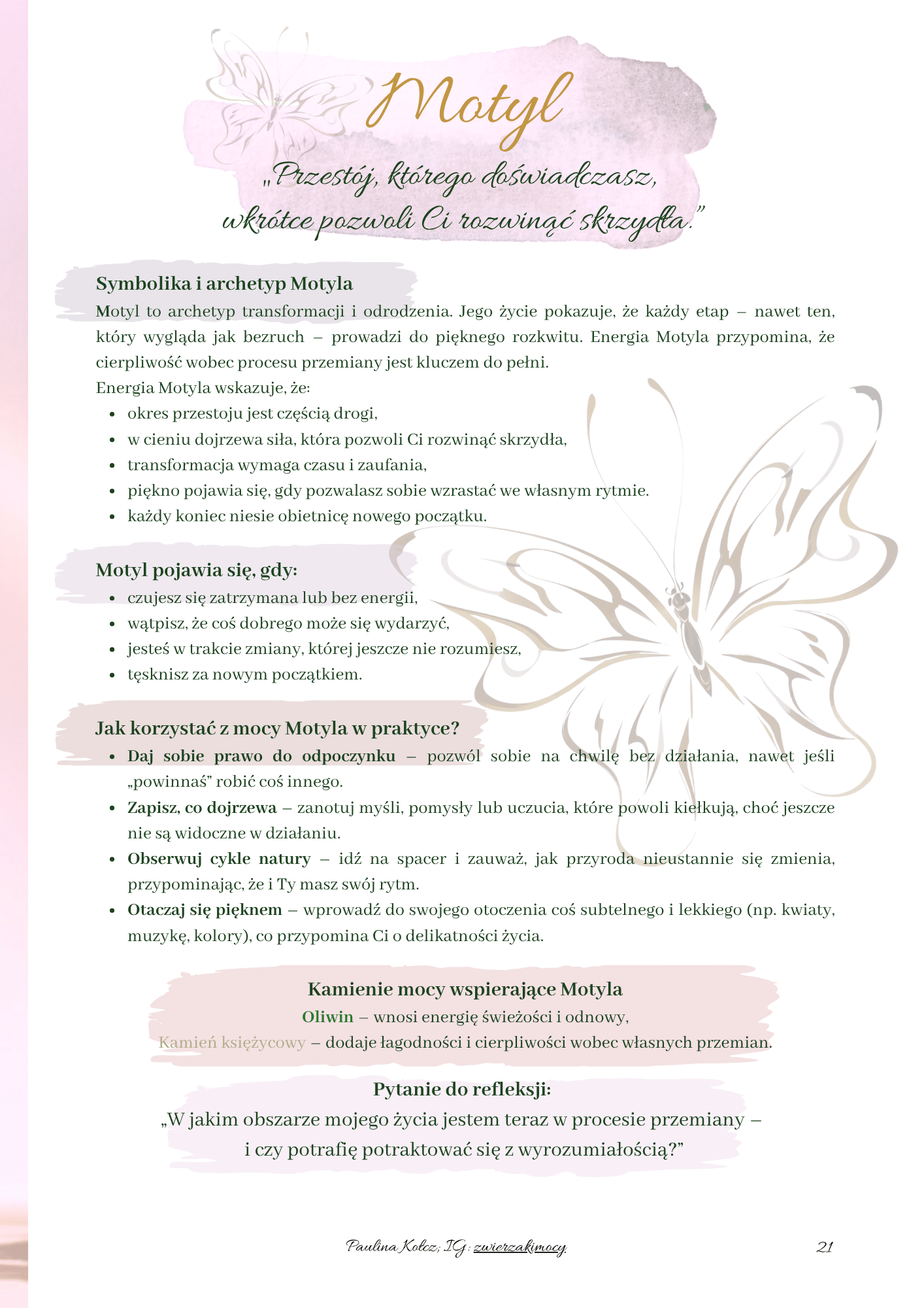 „Zwierzaki Mocy mówią do Ciebie” to ebook, który otwiera drzwi do świata symboli i intuicji. Każde zwierzę niesie przesłanie i prostą praktykę, dzięki której w kilka minut poczujesz spokój, lekkość i inspirację. To przewodnik, który pięknie uzupełnia talię Kart Przewodnictwa Duchowego – Zwierzaki Mocy, dając Ci jeszcze głębsze zrozumienie i konkretne wskazówki do codziennego życia.